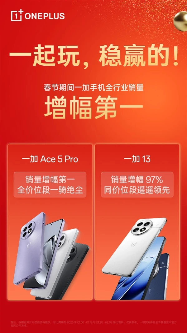 战报显示,一加Ace 5 Pro在所有手机产品里销量增幅第一,在全价位段一骑绝尘,一加13增幅达到97%,也是同价位销量领先产品。