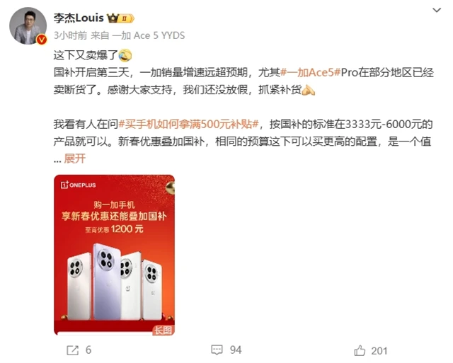 就在今日,一加中国区总裁李杰发文表示,国补开启的第三天,一加手机又卖爆了,提到了一加销量增速远超预期,并且指出一加Ace 5 Pro在部分地区已经卖断货了。并且提到一加还没放假,抓紧补货中。