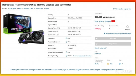 通过代购服务 Buyee,已有一张 RTX 5090 显卡以5197 美元在 Yahoo 拍卖上出售。