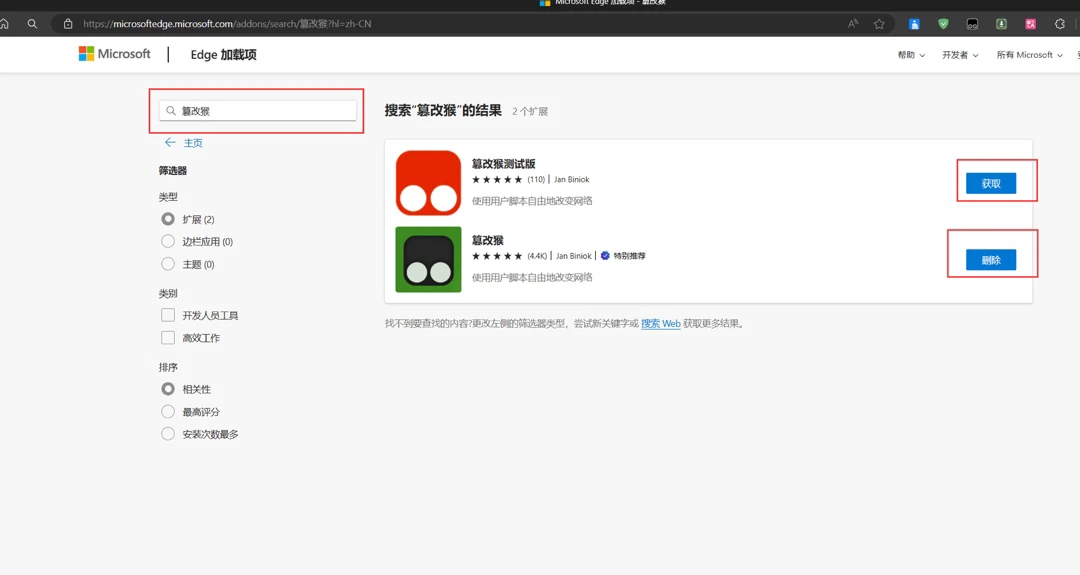 1.4、搜索‘篡改猴’,也就是俗称油猴的插件,点击获取即可安装,可以两个都安装: