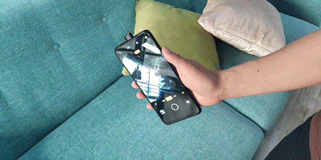这里我们抛起realme X,可以发现手机自动触发了防护机制,回弹了摄像头。