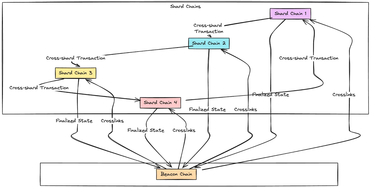 信标链的角色延伸至未来的可扩展性,通过分片链和交叉链接。分片链将与主区块链并行操作,增加数据容量并启用跨分片交易。交叉链接将分片区块连接到信标链,确保最终性和网络集成,这对于可扩展的区块链至关重要。