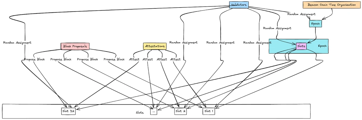信标链在 时期 和 时隙 系统上运行,将时间划分为 6.4 分钟的时期,每个时期包含 32 个时隙。验证者被分配在这些时隙内提议或证明新区块,从而确保连续的交易流和验证。这种随机化结构增强了安全性,并使得任何实体都难以控制网络。