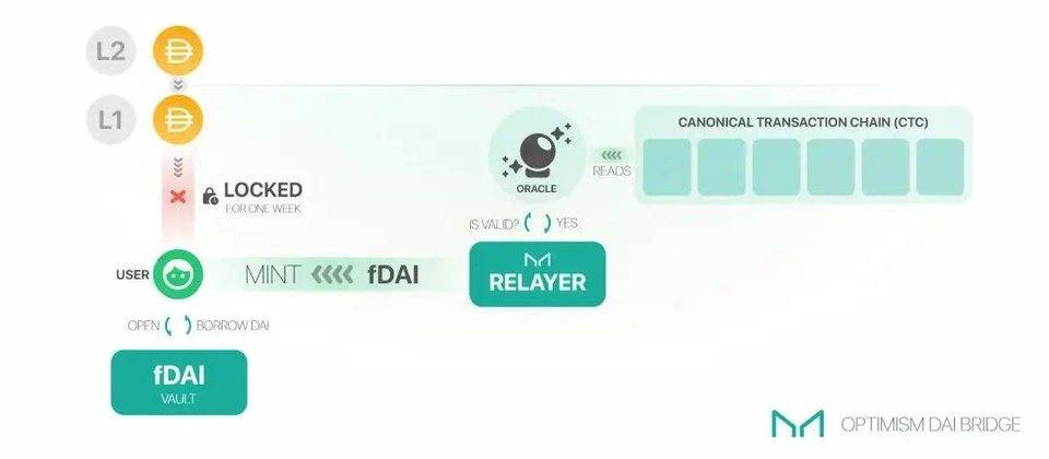 用户先提交 Layer 2 至 Layer 1 的提款需求,预言机读取 CTC 的交易后,就可以为用户提前 7 天,在 Layer 1 上铸造名为 fDAI 的流动性凭证。然后用户可以通过「fDAI 金库」,将 fDAI 抵押然后换出 DAI。