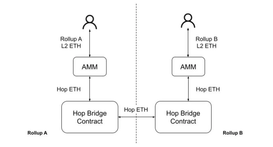 使用 Hop 的方案时,资产需要通过 Hop 流转到 Layer 2 网络中,比如通过 Hop 的资产桥进入二层的 ETH 被称为 Hop ETH(或 hETH) 。hETH 和 ETH 是完全等价的,至少可以通过 Hop 完成兑换。