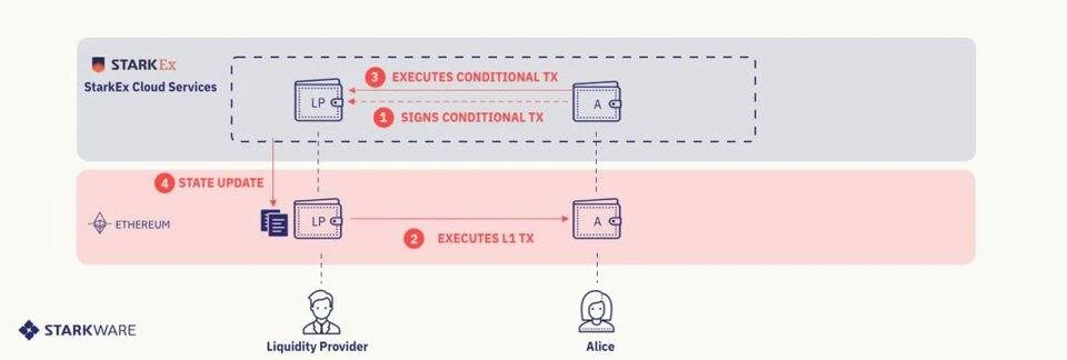 零知识证明研发机构 StarkWare 于今年 1 月正式推出基于 ZK Rollup 概念的扩容网络 StarkNet,不过这不是本文的主题,而是他们为 Layer 2 的可互操作性提供的完整解决方案,基于「条件转账」 (Conditional Transactions) 或「条件支付」 (Conditional Payment) 实现。