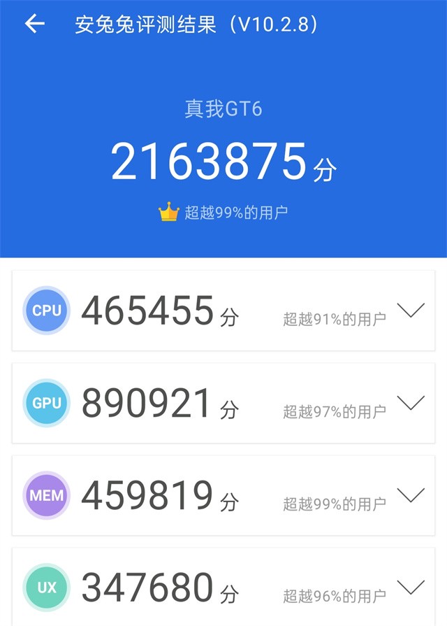真我GT系列一直都是整个真我品牌的性能先锋,真我GT6也依旧配备了当下最新的硬件,搭载了高通第三代骁龙8移动平台,4nm先进制程工艺打造,最高3.3GHz频率,性能表现毋庸置疑,跑分成绩也稳居目前手机市场第一梯队。