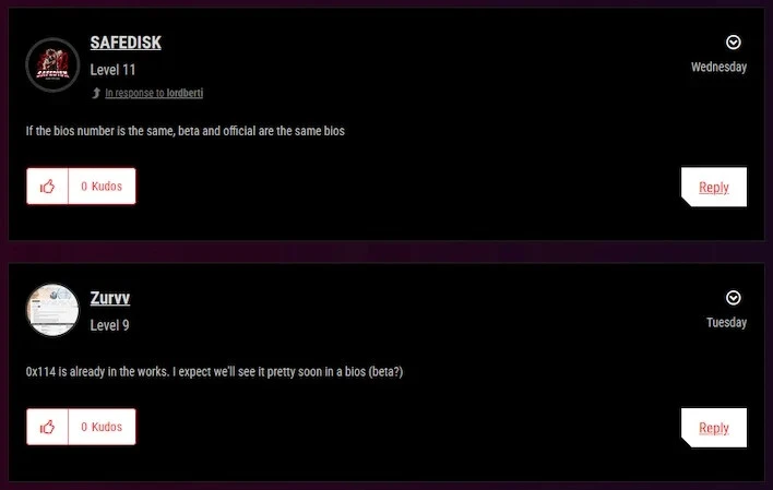 据 ROG 论坛上的一位用户(@9550pro ) 报告,微码 0x114 已在开发中,可能会在即将到来的 BIOS 更新中发布。目前尚不清楚它是测试版 BIOS 还是官方 BIOS,但正如 SAFEDISK 所说,“如果 BIOS 编号相同,则测试版和官方 BIOS 是相同的”。