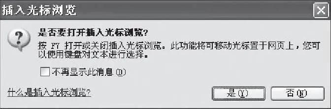 在IE8或以上版本中打开页面后,按下快捷键F7,弹出是否启动“光标浏览”窗口(如图)。单击“是”,在需要选中文字起始位置处单击鼠标左键,可以看到此处显示光标“|”,这时按住Shift键,将鼠标移动到文字结尾处再次单击左键,这段文字即被选中。