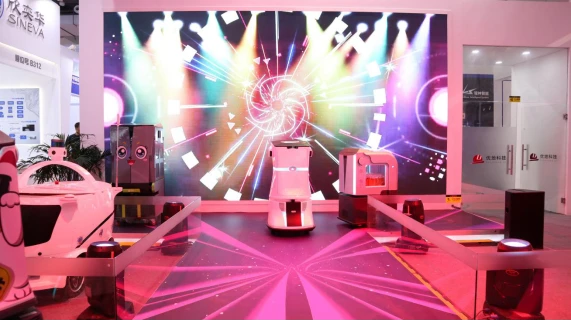 大会现场,优小妹三代和优小弟三代在T型展位上随着动感音乐进行了行走表演。优小妹三代播放着视频灵活绕过摆放在眼前的障碍物,优小弟三代绕过障碍物后装载的啤酒杯未有半点撒漏,展现了优地机器人精确的环境识别能力和灵活稳定的配送能力;基于机器人多台协作的先进算法,在舞台路口,优小弟三代和优小妹三代相遇时,优小弟三代会主动停下来,成功让优小妹三代先走,确保真实生活场景中多台同时服务能力。