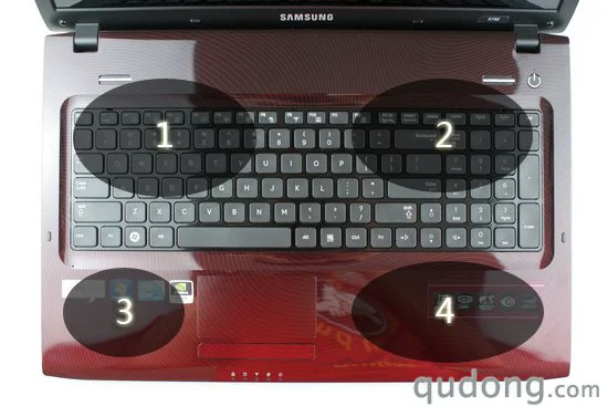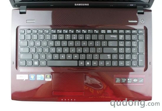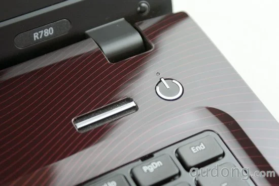 在键盘区域的正上方我们可以看到,三星R780的电源按键、电源指示灯和音响声道,严格的说,三星R780的该处设计并不是非常时尚,反而带有古老浓厚的“乡土”气息。