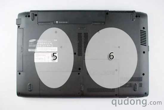 接下来我们用螺丝刀分别将笔记本底部的盖板打开,其中两部分分别为笔记本的硬盘区域和内存区域,其中三星R780所采用的硬盘为其自家产品,型号为三星HM500JI,容量500GB,转速为5400转每分钟,拥有8MB高速缓存,采用SATA二代接口,支持NCQ技术,其实这是一款已经面世有一段时间的产品了,在后的性能测试部分我们将为大家展示其性能表现。