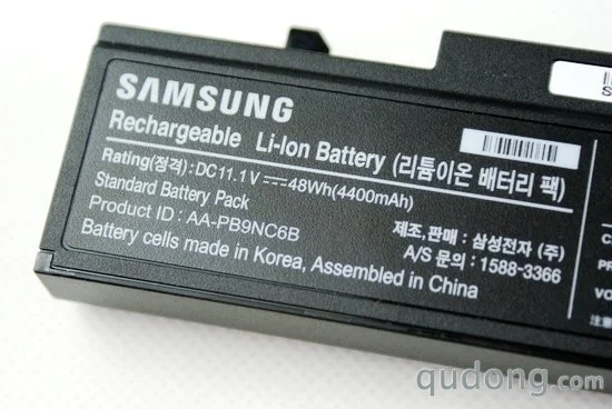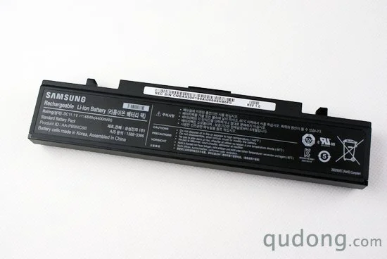 三星R780的电池设计非常人性化,电池本身具有电量检测功能,只需要按动电池上的电量按键即可显示当前电池内剩余的电量百分比。我们通过电池上的铭牌也可以看到,该电池电芯来自于韩国,而组装则是在中国国内完成的。