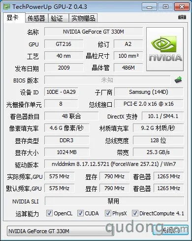 显卡芯片 | NVIDIA GeForce GT 330M(40nm/1GB/128bit/DX10.1) |