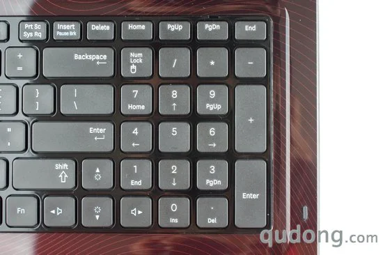 键盘区域的外围和掌托部分采用了同A面相同的材质和风格,而在使用时我们对此种材质的触感也抱有好感,不过同A面的设计一样,唯一不足的就是容易留下指纹痕迹。