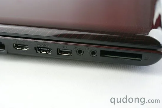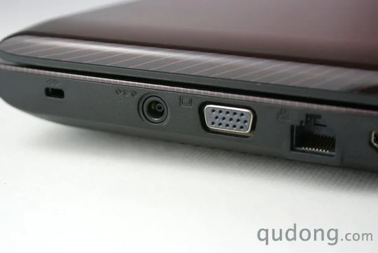 我们先来看机身左侧接口,从上至下分别为:安全锁孔、电源适配器接口、15针D-sub(VGA)视频输出接口、RJ45高速以太网接口、HDMI高清视频输出接口、e-SATA兼USB多合一接口、USB2.0接口、音频输入输出以及目前已经较为少见的Express card槽位。其中新旧两种视频输出可谓三星R780为影音用户提供了非常方面的兼容方式,并且e-SATA的引用为USB3.0普及之前做好了高速传输的过渡准备,而Express card插槽显然也是为外接扩展设备保留了余地。