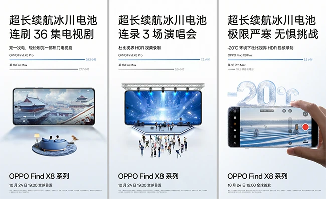 此外,全新一代冰川电池还具备适应极端温度的性能,即使在温度-20°C极端环境中,Find X8系列依然可以正常工作,确保用户在严寒天气下,都能享受到稳定可靠的续航体验。