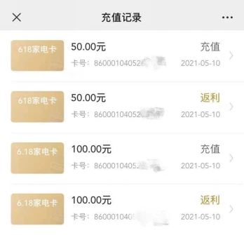 活动期间内,提前购买面值50或100元的618家电膨胀卡,即可获得同等金额的返利卡券,618期间凡购买苏宁大家电自营部分商品(含彩电、冰箱、洗衣机、空调品类),便可同时叠加满减、折扣、分期优惠等原有优惠活动使用。
