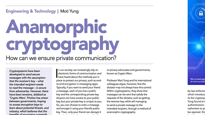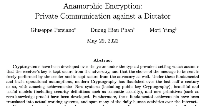 [1] Persiano, G., Phan, D. H., & Yung, M. (2022, May). Anamorphic encryption: private communication against a dictator. In Annual International Conference on the Theory and Applications of Cryptographic Techniques (pp. 34–63). Cham: Springer International Publishing.