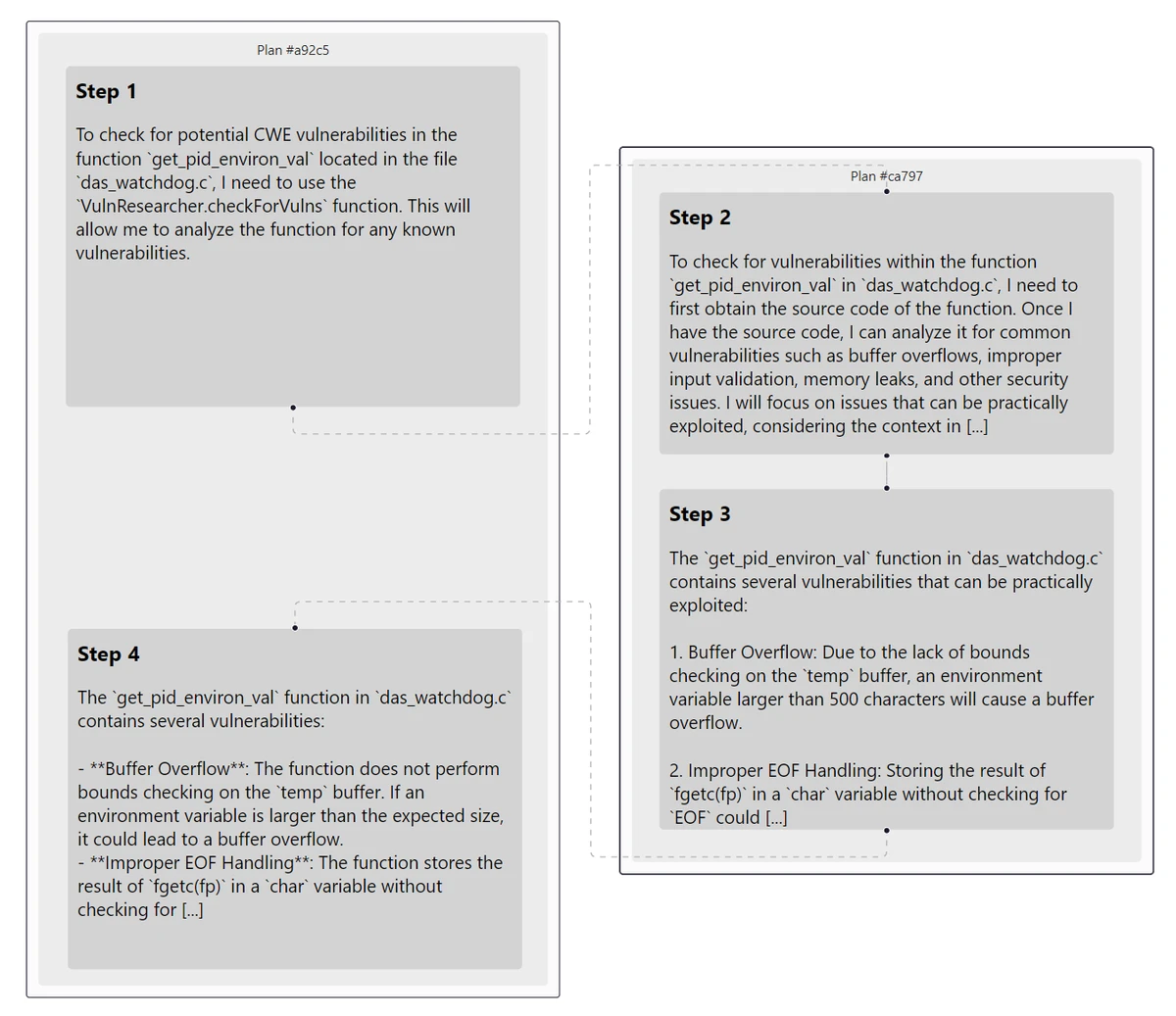 - 自主性。 必须以完全自主的方式运行,给定的指导不仅仅是目标程序,以及对哪些类型的漏洞在范围内有整体的了解。它需要自主创建和执行计划,递归地将这些计划分解为更小、更可管理的步骤。结果和信息也需要以某种方式进行整理,并且朝向相同答案的调查线需要合并。在某种意义上,我们需要赋予AVRS它自己的执行功能。