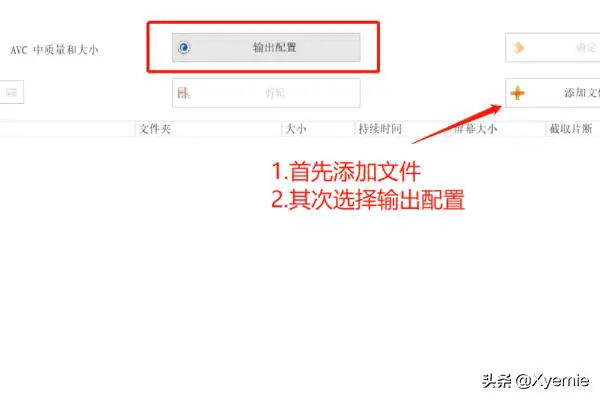 3、进入配置页面,首先【添加文件】加入需要转化的视频,其次点击【输出配置】进入配置详情