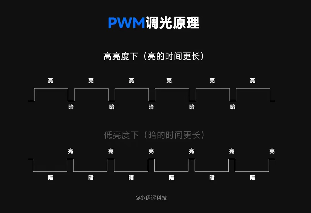 PWM调光(脉宽调制调光):不直接调节电流,而是通过快速开关屏幕的亮与暗来模拟不同亮度。这种方法在OLED屏幕上普遍使用。