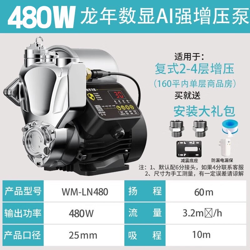 威猛480W增压泵,15年匠心之作,畅销24国,服务千万家庭。600W无刷铜芯电机,32层高楼依然出水强劲。采用FOURTURBOCHARGING技术,0秒瞬间增压,热水澡随时享受。32楼高楼供水无忧,10米自吸,80米扬程,水压问题一次解决。智能数显AI控制,节能省电,月耗电不到1度。多重防护,防尘防水防漏电,确保使用安全。四层防锈工艺,水质干净不发黄。简易安装,老人也能轻松搞定。选择威猛,让全家用水无忧。