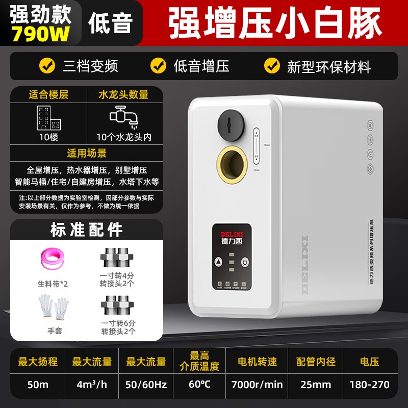德力西家用变频增压泵,以其智能变频技术,精准满足中国家庭用水需求。采用高性能AI智能变频芯片,瞬间启动,快速增压,根据水流速度自动调频,节能高效。泵身采用304不锈钢滤网,耐用防腐,相比劣质滤网,更能保障水质安全。
