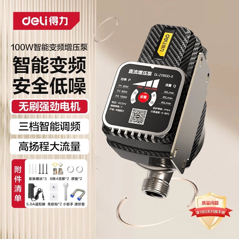 最后,如果您注重产品的耐用性和安全性,得力100W增压泵的IP64防护等级,保证了其在多种环境下的稳定运行。选择得力,就是选择了高品质的用水生活。