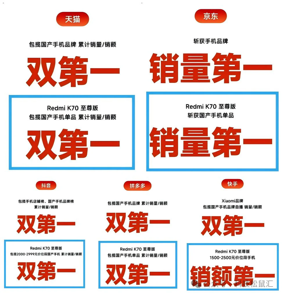 红米K70至尊版包揽天猫平台国产手机单品累计销量。和销售额双第一。京东平台,红米K70至尊版斩获国产手机单品销量第一。抖音平台,红米K70至尊版包揽2000-2999价位段国产手机累计销量。和销售额双第一。拼多多平台,红米K70至尊版包揽国产手机单品累计销量和销售额双第一。快手平台,红米K70至尊版拿下1500-2500价位段手机销量额第一。红米K70至尊版拿下5个平台的销量或销售额冠军,这款手机到底强在哪?