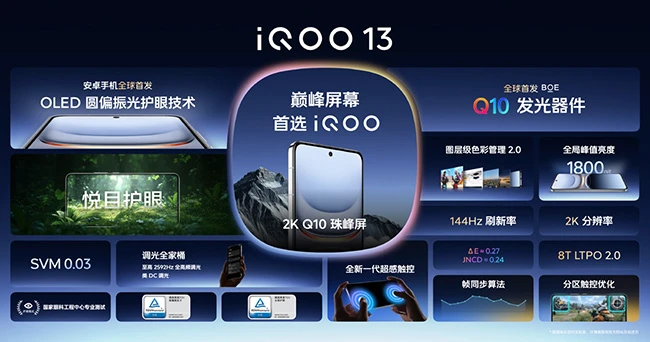 屏幕方面,iQOO 13与京东方联合研发了2K Q10珠峰屏,全新的Q10发光器件,经过45项设计优化和34种组合验证,HBM亮度高达1800nit,还首发了安卓手机OLED圆偏振光护眼技术及悦目护眼,可以显著降低眼睛疲劳和干眼症状,带来更自然舒适的视觉体验。