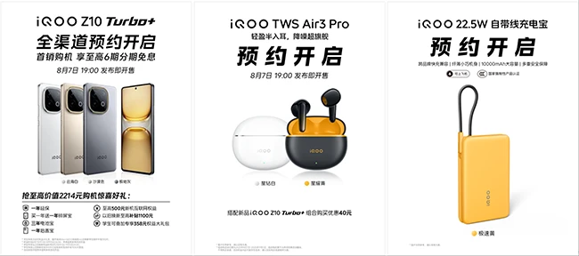 “性能续航双王炸”iQOO Z10 Turbo+ 作为行业唯一的超大电池旗舰性能机,将于 8 月 7日 19:00 正式发布并开售,现已开启全渠道预约。与 iQOO Z10 Turbo+ 一同开启预约的还有 iQOO IoT 的两款新品 — iQOO TWS Air3 Pro 半入耳降噪耳机和 iQOO 22.5W 自带线充电宝,与新机搭配组合购买还有 40 元优惠,喜欢的朋友赶紧预约起来吧!