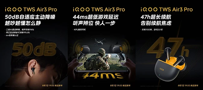 “KPL 推荐耳机”iQOO TWS Air3 Pro 挑战年度最强半入耳 TWS,带来降噪更强的 50dB 旗舰级降噪体验、44ms 同档最低游戏时延、47 小时同档最强续航表现和“充电 10 分钟,游戏 2 小时”的快速回血能力。iQOO TWS Air3 Pro 降噪能力十分凸出,具备三麦 AI 通话降噪,可抑制 94% 的噪声,常见生活噪音更可直接消除 99.6%,更通过 A+ 级降噪认证。