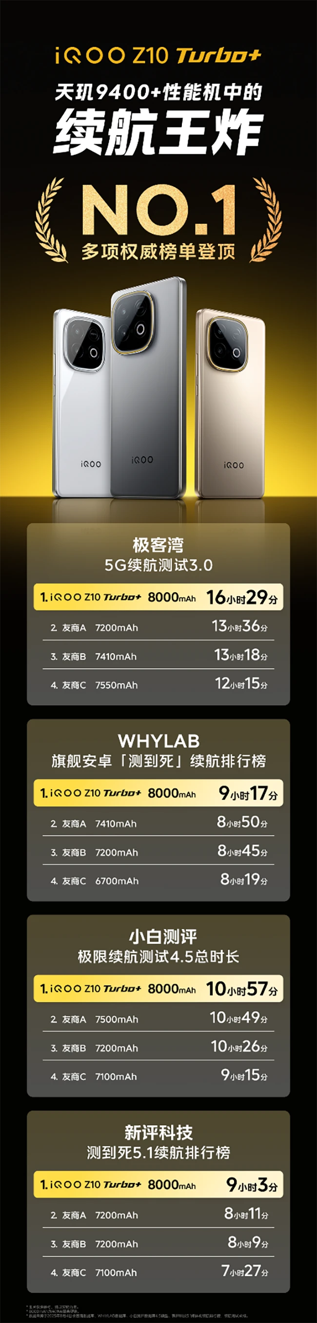 为了让用户可以持久畅享“旗舰双芯”支撑下的行业最强游戏性能表现,iQOO Z10 Turbo+ 拥有旗舰平台产品中最大的 8000mAh 超薄蓝海电池,并具备能够边充边玩不易发热的全场景直驱供电技术,以及精准覆盖核心热源的 iQOO 最大 7K 冰穹 VC,确保激战时刻手机持久高能,更助用户轻松冷静制胜。iQOO Z10 Turbo+ 的超强续航实力取得了极客湾 5G 续航测试 3.0:16 小时 29 分、WHYLAB 旗舰安卓“测到死”续航排行榜:9 小时 17分、小白测评极限续航测试 4.5 总时长:10 小时 57 分和新评科技测到死 5.1 续航排行榜:9 小时 3 分的优秀成绩,在续航榜单中以较大优势领先第二名,轻松问鼎续航冠军宝座。