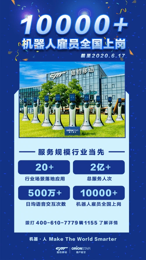 618如火如荼,大家都在忙着清空购物车,国内机器人行业却出了个大新闻:超10000名来自猎豹移动和猎户星空的机器人“雇员”正式在全国上岗!包括大型商场、展馆景区、KTV、图书馆、企业前台、医疗机构、酒店、政务、法务、税务等在内的20多个行业场景。