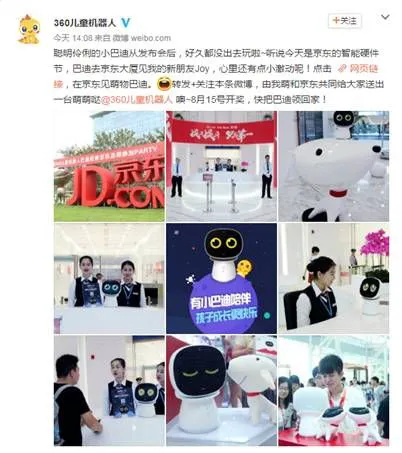 7月25日,360儿童机器人官方微博晒出了一组照片,微博上说,360儿童机器人巴迪趁着京东智能硬件节,来找Joy玩耍。京东总部门口不仅悬挂了写有“欢迎360儿童机器人巴迪前来京东总部参加party”的横幅,受到了工作人员的热情欢迎,可爱的巴迪还临时做起了代班前台。