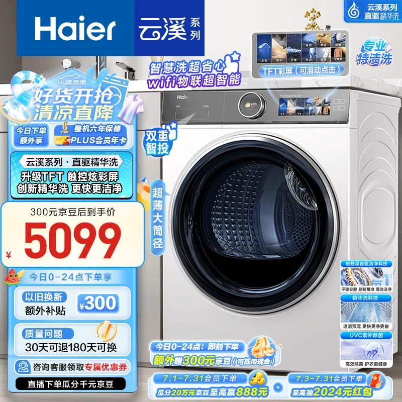 其次,产品特点方面,这款洗衣机配备了FPA直驱电机,拥有525mm大筒径和TFT炫彩触控屏,UVC紫外除菌功能更是让人眼前一亮。整机三年包修,体现了海尔对产品质量的信心。智能投放功能、速溶预混高活性洗净技术、高压直喷系统等多项先进技术,使得这款洗衣机在使用体验上更加出色。