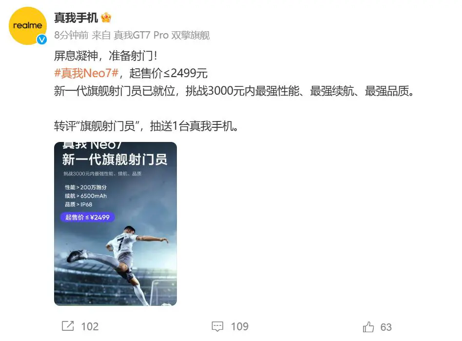今天,真我手机官方宣布,真我Neo7起售价将≤2499元。