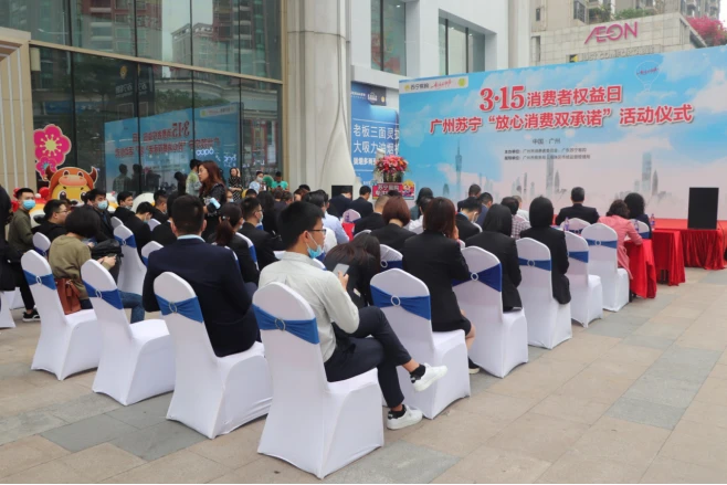 2021年315国际消费者权益日来临之际,3月12日上午,在广州市商务局、海珠区市场监督管理局的指导下,由广州市消费者委员会、广东苏宁易购主办的3.15消费者权益日——广州苏宁“放心消费双承诺”活动仪式在苏宁易购达镖国际店户外广场举行。广州市商务局商贸服务业处副处长吴三宝、广州市消费者委员会副主任张开仕、海珠区市场监督管理局叶建武调研员、广东苏宁易购总经理严春永、苏宁店长代表、苏宁家电供应商代表等出席了此次活动。