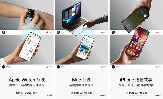 全新升级的 ColorOS 16 更实现了前所未有的跨生态互联体验,新增支持 Find X9 系列与 Apple Watch 互联,流体云、运动数据等可无缝流转至 Apple Watch ;与 Mac 互联也再次升级,可将 Find X9 系列屏幕投屏至Mac,并实现原生操作;当然也实现了与iPhone 之间的通信共享,对于双持用户,可直接在 Find X9 系列上接听 iPhone 的来电,以及实现短信、通知实时同步。