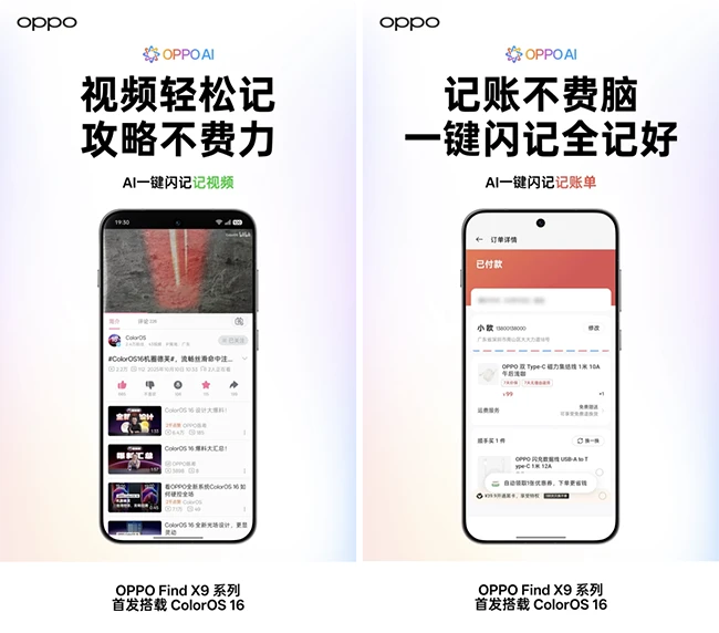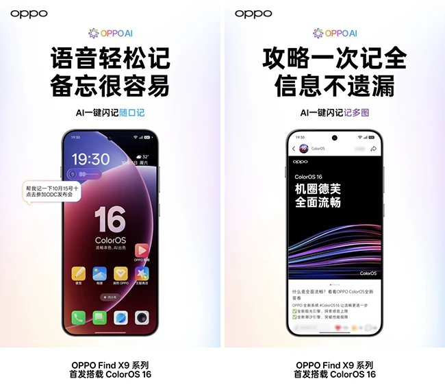 2025 年 10 月 14 日,中国,深圳 —— OPPO 正式官宣「旅拍神器」 Find X9 系列将全球首发搭载 ColorOS 16 系统。新系统 AI 一键闪记重磅升级,不仅记得更深,而且记得更全;跨生态互联也全面升级,手表、耳机、电脑、短信通话互通无阻;一碰互传也全面升级,更快更稳定。