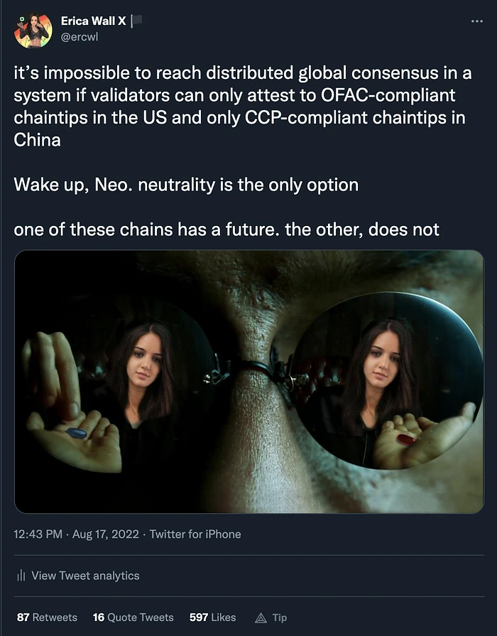 你看,不需要一个聪明的人就能弄清楚为什么 OFAC 链基本上是胎死腹中。你认为 OFAC 链应该如何工作?所有的验证者都应该同意一个要审查的地址列表吗?该列表是否包含来自所有国家/地区的制裁列表?美国的 OFAC,但是俄罗斯的呢?中国的呢?朝鲜的呢?如果每个人都想互相制裁,你如何达成共识?