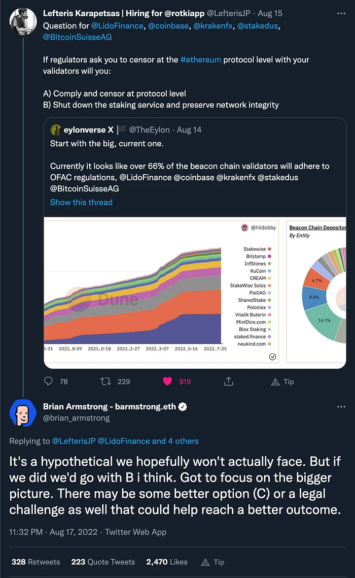 这就是为什么 Coinbase 的 CEO Brian Armstrong 的这些评论给人们敲响了警钟,即许多验证者受到必须遵守美国法规的受监管实体的控制。
