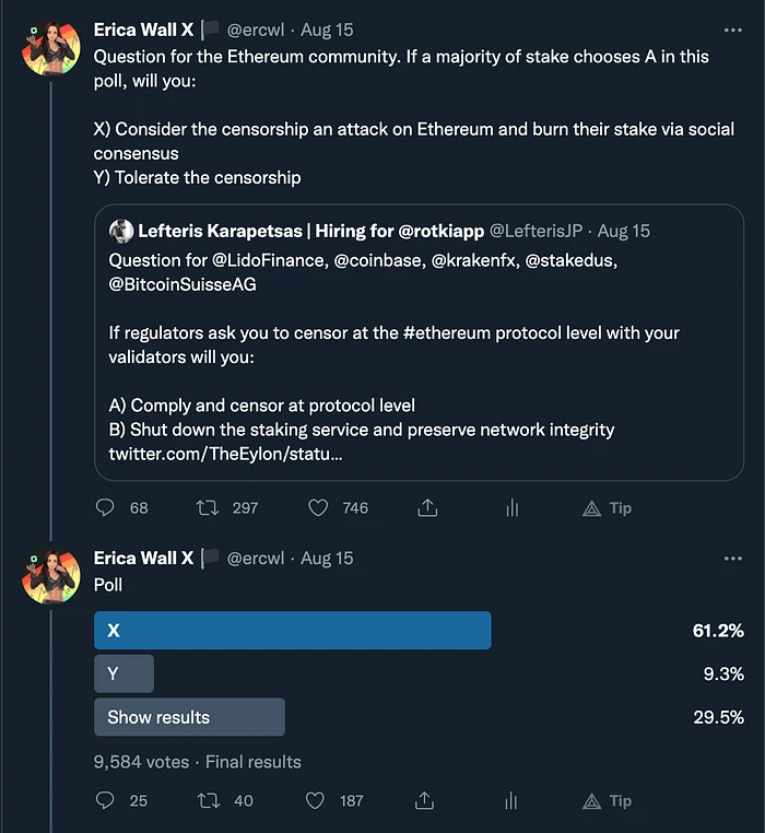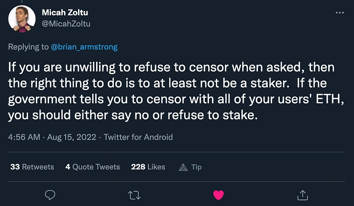 此外,如果审查停止发生仅仅是因为 Coinbase “选择” 退出他们的 质押 以尊重以太坊社区的价值观,那么似乎以太坊的审查抵制是不可信的,仅仅是只要受监管的公司实体 允许 它存在,它才存在,这不是审查抵制的含义。