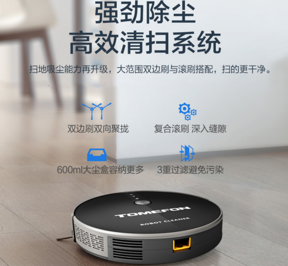 斐纳TOMEFON TF-MX80扫地机器人不仅能够高效除尘,还拥有强效祛渍的功能。湿拖时,该产品可以做到0距离紧紧贴合地面,再配合恒压浮动技术,能深度除去地面上的各种污渍,还人们整洁清新的室内环境。