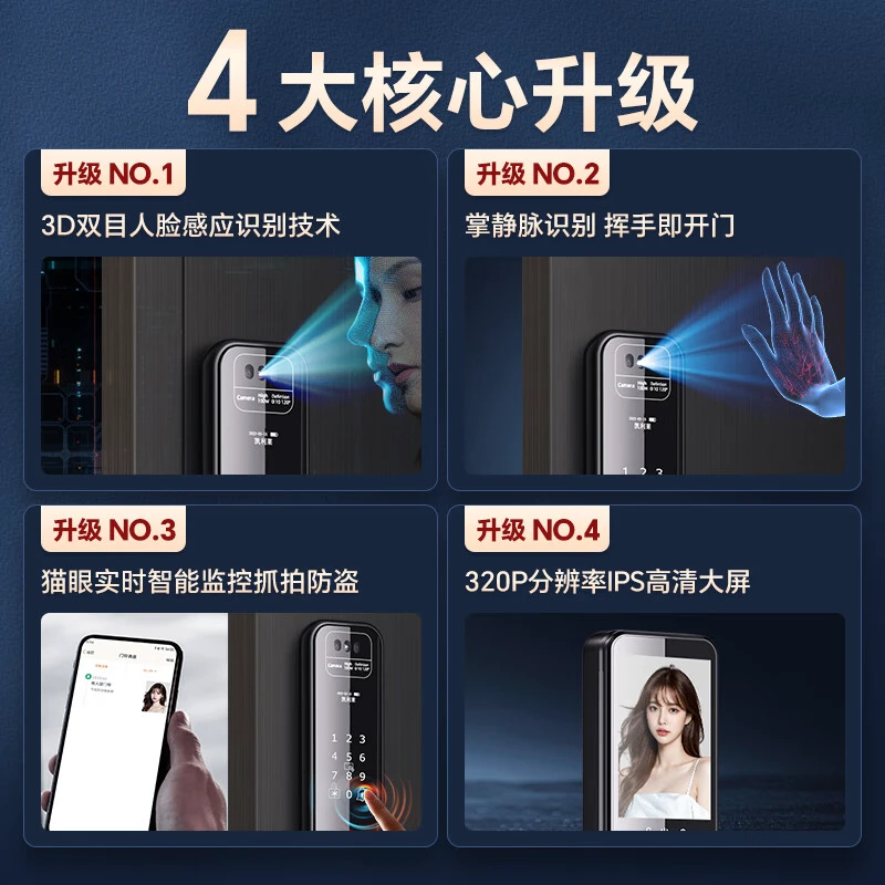 哎呦,这位看官,您可算找对门了!瞧瞧咱这凯迪仕智能锁K20ProMax升级版,3D仿生人眼识别,出门不带钥匙,红外夜视猫眼,黑暗中也能看得清清楚楚。室内4英寸IPS高清大屏,门外啥情况一目了然,这不就是给您装了双千里眼嘛!