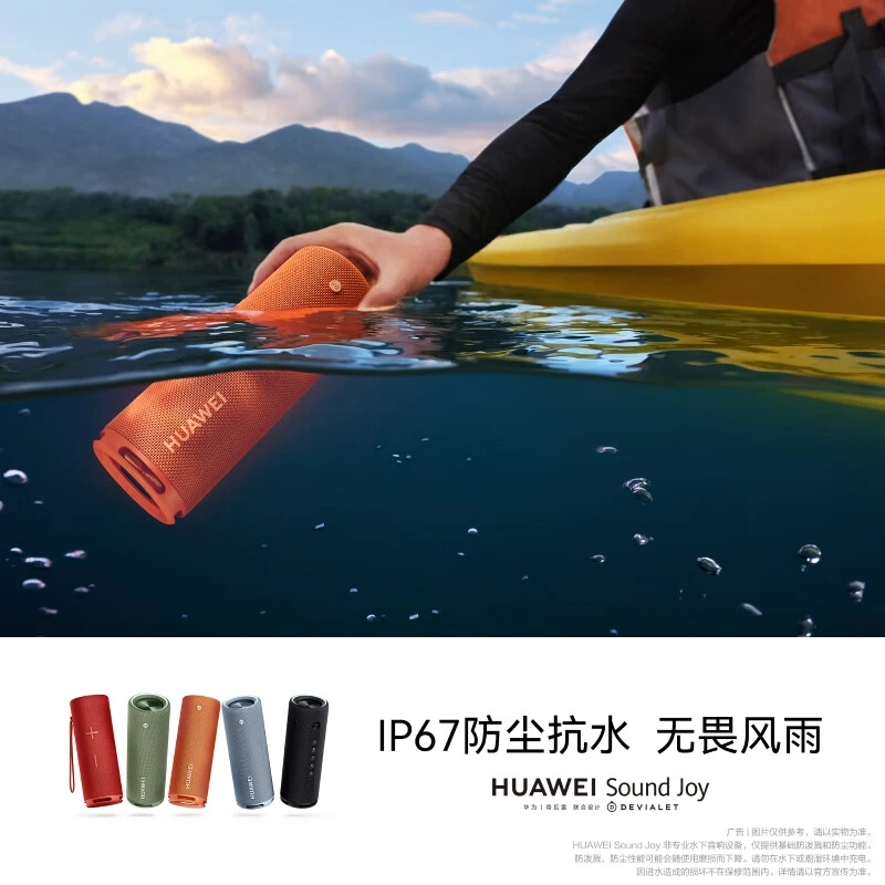 华为Sound Joy便携音箱,真是智能又方便!这款音箱直径73mm,高202mm,小巧轻便,颜色多样,带出去超有面子。它有4个扬声器单元,声音响亮,最大声压达到79dB,频响范围50Hz-20kHz,音质清晰。电池容量8800mAh,能连续播放26小时,还有40W快充,充电10分钟就能听1小时。IP67级防尘抗水,户外用也放心。
