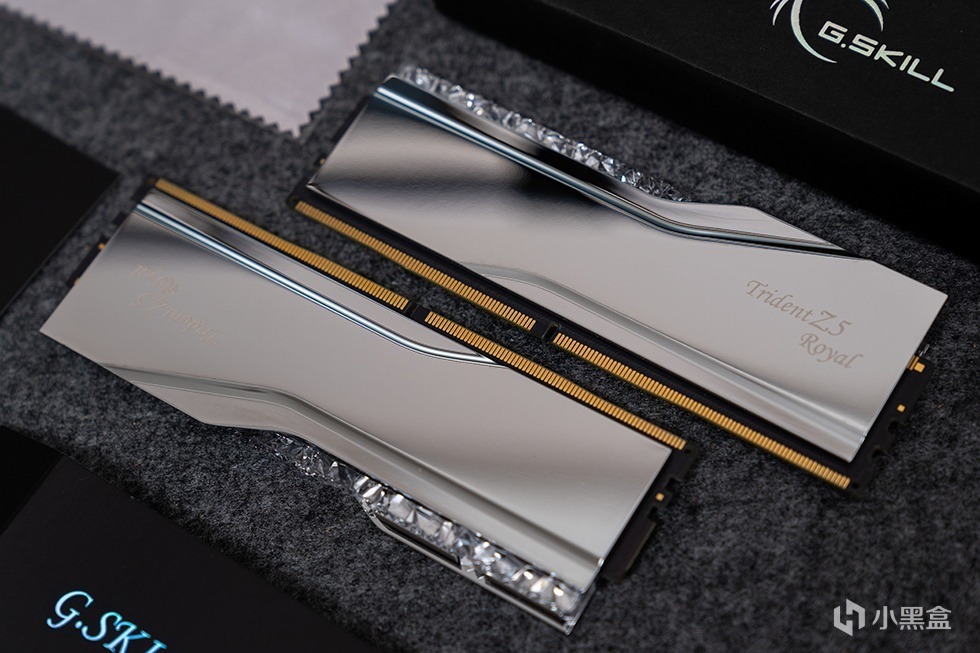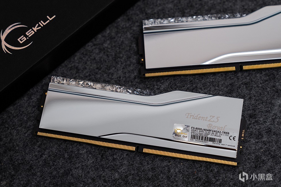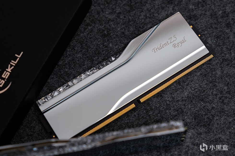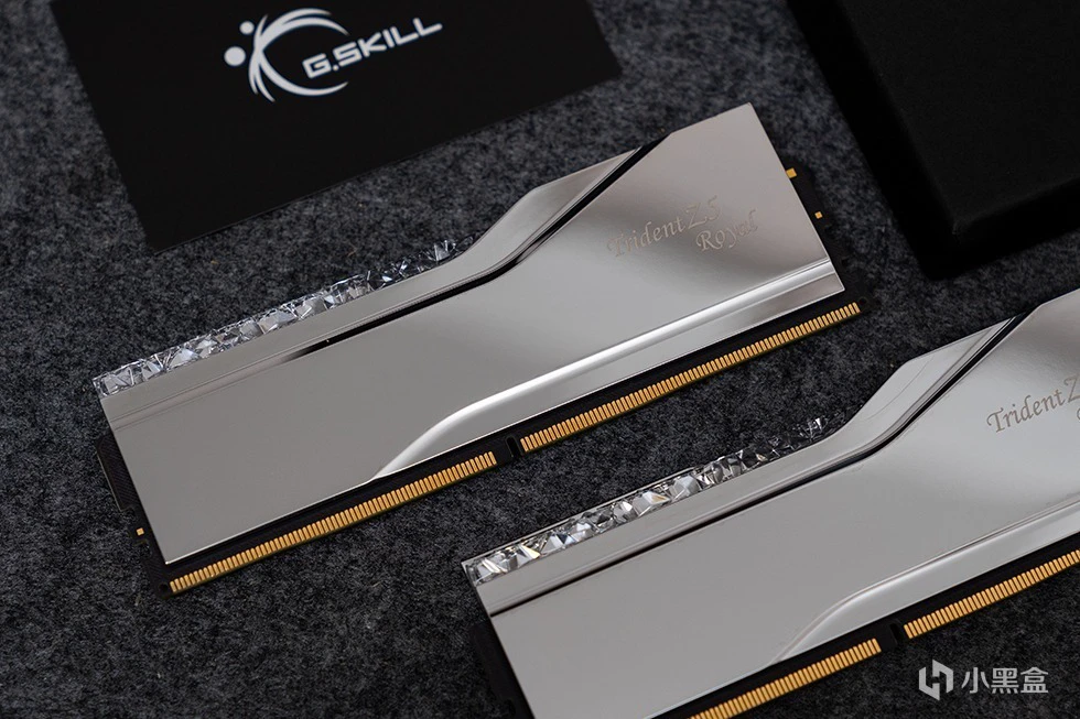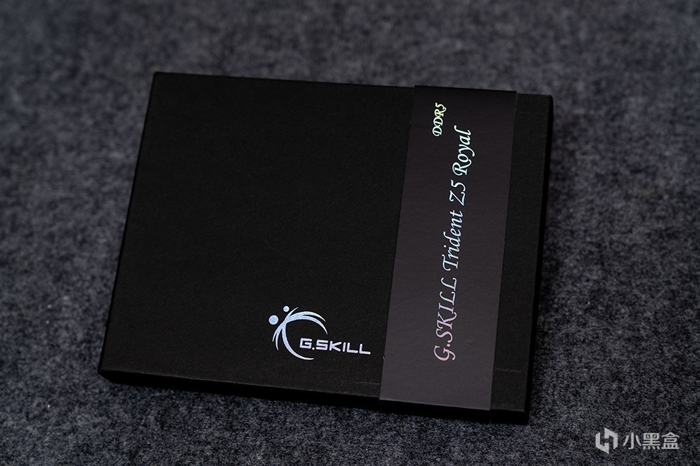 Trident Z5 Royal 皇家戟DDR5-8000内存在外包装上十分的素雅低调,全黑的硬核包装盒外套了一个腰封。腰封上带有烫银工艺的G.SKILL Trident Z5 Royal 字样。