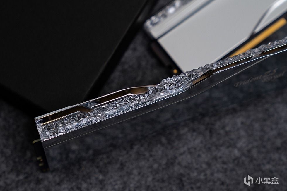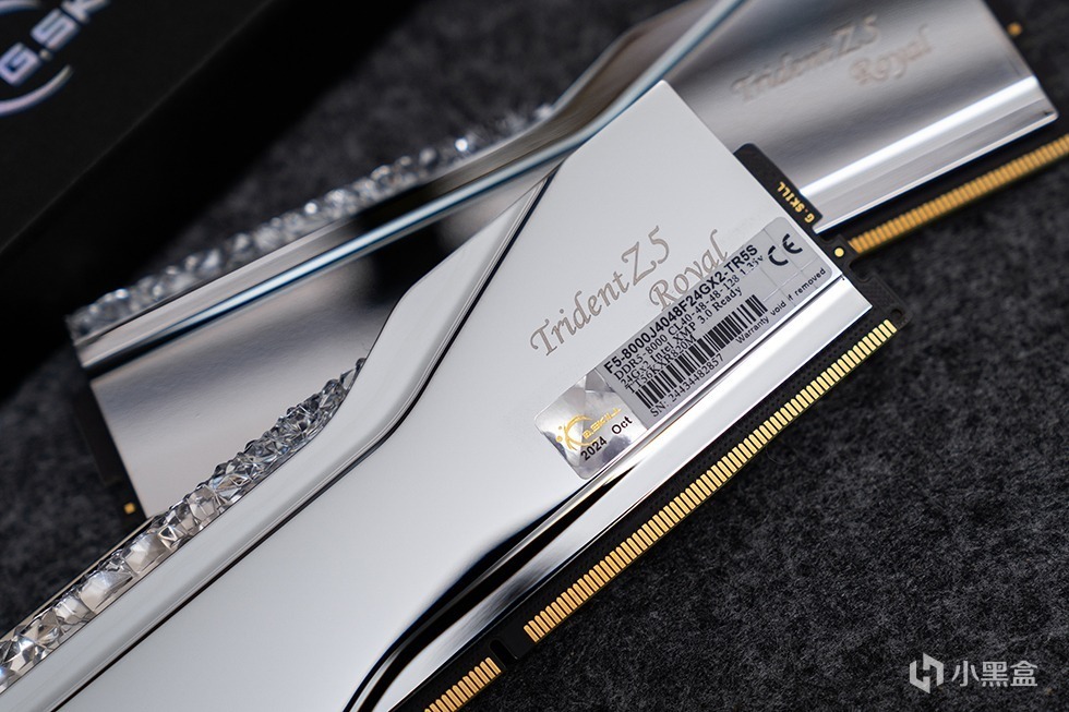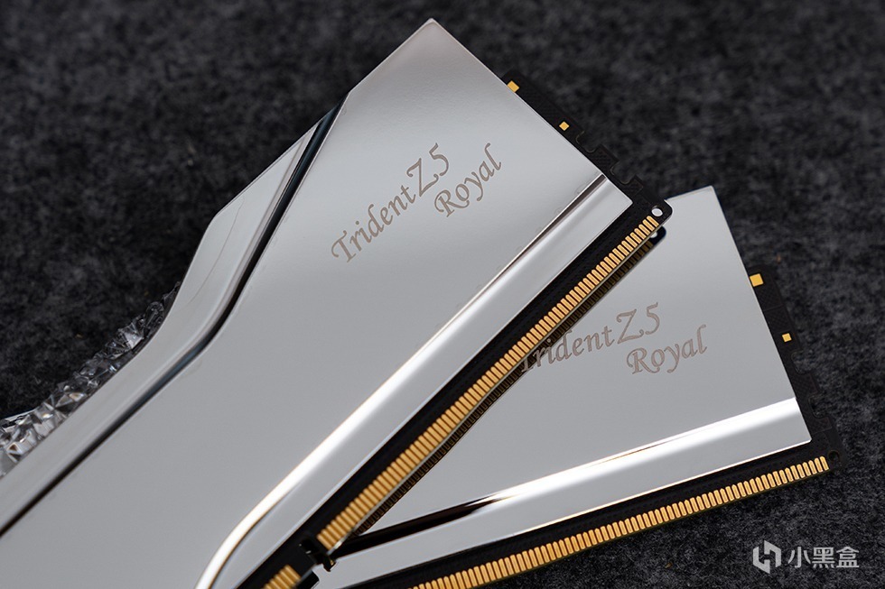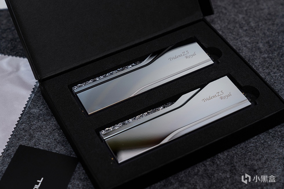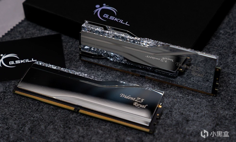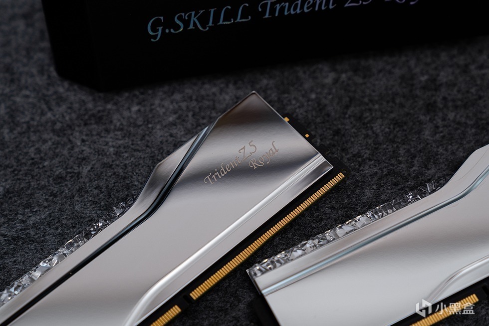 Trident Z5 Royal 皇家戟DDR5-8000内存在外包装上十分的素雅低调,全黑的硬核包装盒外套了一个腰封。腰封上带有烫银工艺的G.SKILL Trident Z5 Royal 字样。