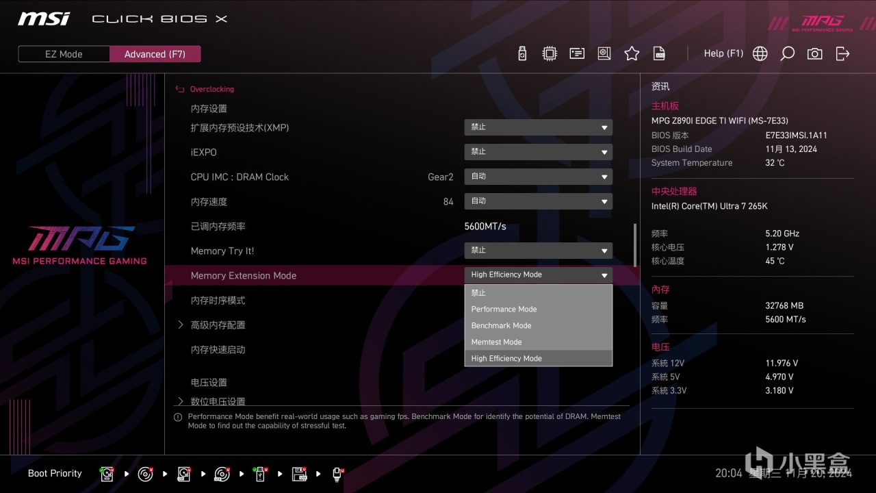 微星MPG Z890I EDGE TI WIFI在Advanced模式下内存扩展模式选项提供 4 种相同频率的预设模式——性能模式、基准测试模式、高效模式和内存测试模式——以优化速度和延迟等内存参数,以提高在基准测试、游戏等场景中的性能。实际测试中推荐开启 High Efficiency Mode。